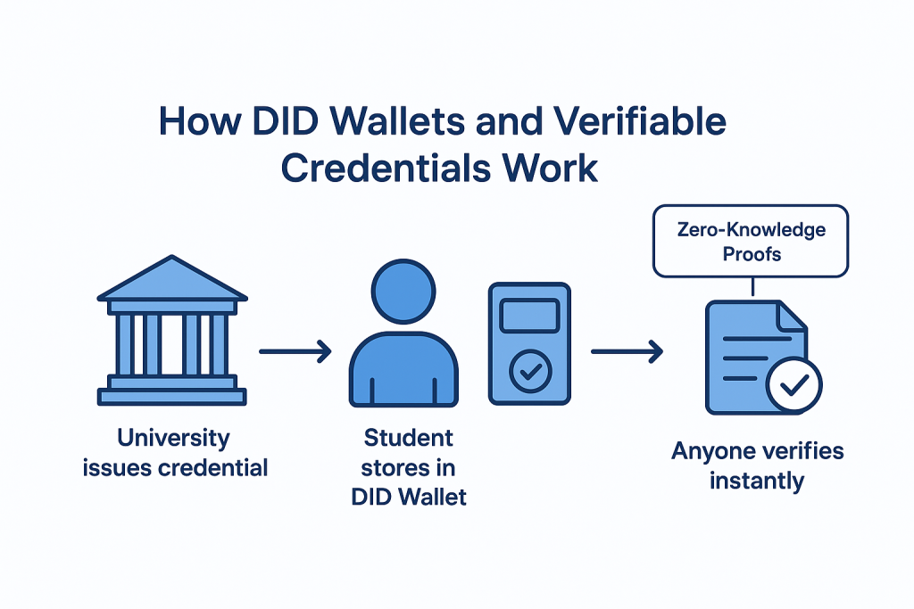 Verifiable Credentials are tamper-proof digital documents. A university can issue a degree or transcript as a credential. The student adds it to their DID Wallet. Anyone can verify it instantly without calling the university.